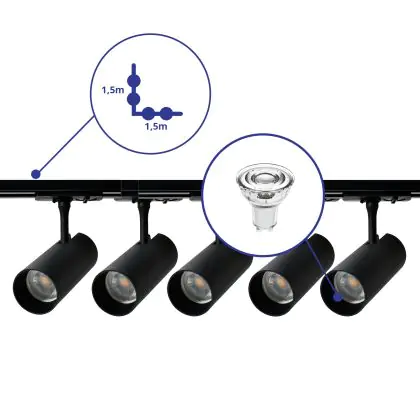 Bright Choice Complete Set 1-Phase Rail L 1,5 x 1,5 Meter Black | incl. 5x Spot + GU10 2700K 3W Dimmable + End Cap, Power Connector and L -Connector