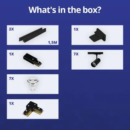 | Manufacturer Name | Complete L shaped 1-Phase Track Set Black incl. 7x Spot fixture + GU10 2700K 3W Dim – 1,5 x 1,5 mete | |