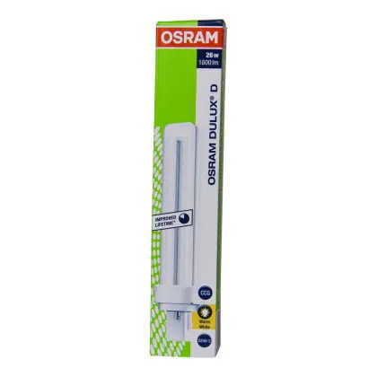 The Osram Dulux D can be used in combination with a conventional ballast. The lamp has a short and compact lamp base type G24d-3. This means that each of these compact fluorescent lamps has a base with 2 pins. The lamps Osram Dulux D 26W 830 has a length of 172 mm.