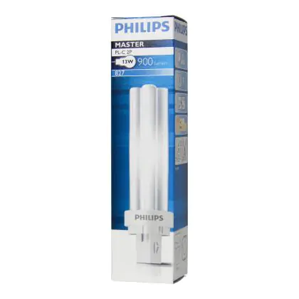 Philips PL-C 2P are compact fluorescent lamps with separate power supplies. They are energy efficient lamps with a 2 pin socket. These lamps run on an electromagnetic control equipment. Each compact fluorescent lamp of this range has a base type G24d-1 with 2 metal pins. Philips PL-C 13W 827 2P lamps have a size of 1450 cm.